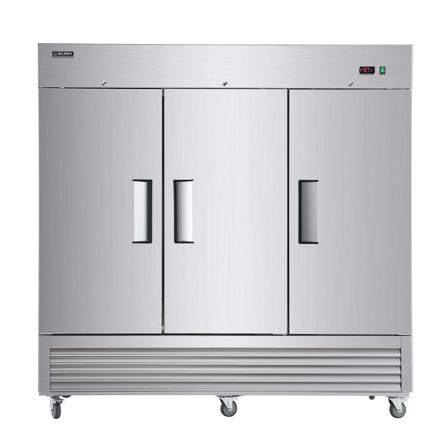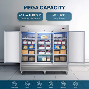 Mega Capacity Freezer for All Needs: Wilprep's 81" triple door commercial freezer offers a volume of 60.9 cu. ft. and a temperature range of -11 to 14°F, letting you properly store meat, seafood, desserts, and more frozen foods for your business.