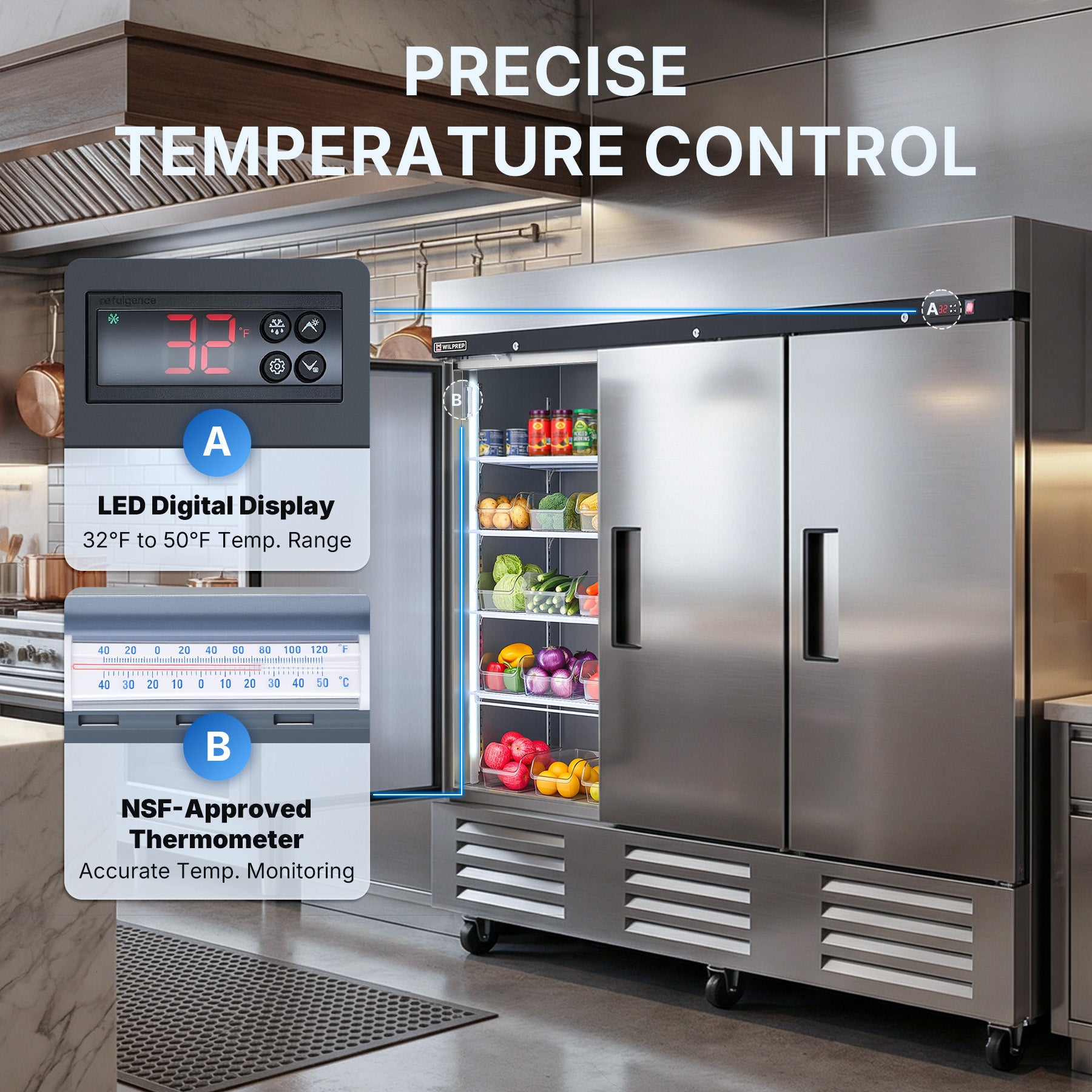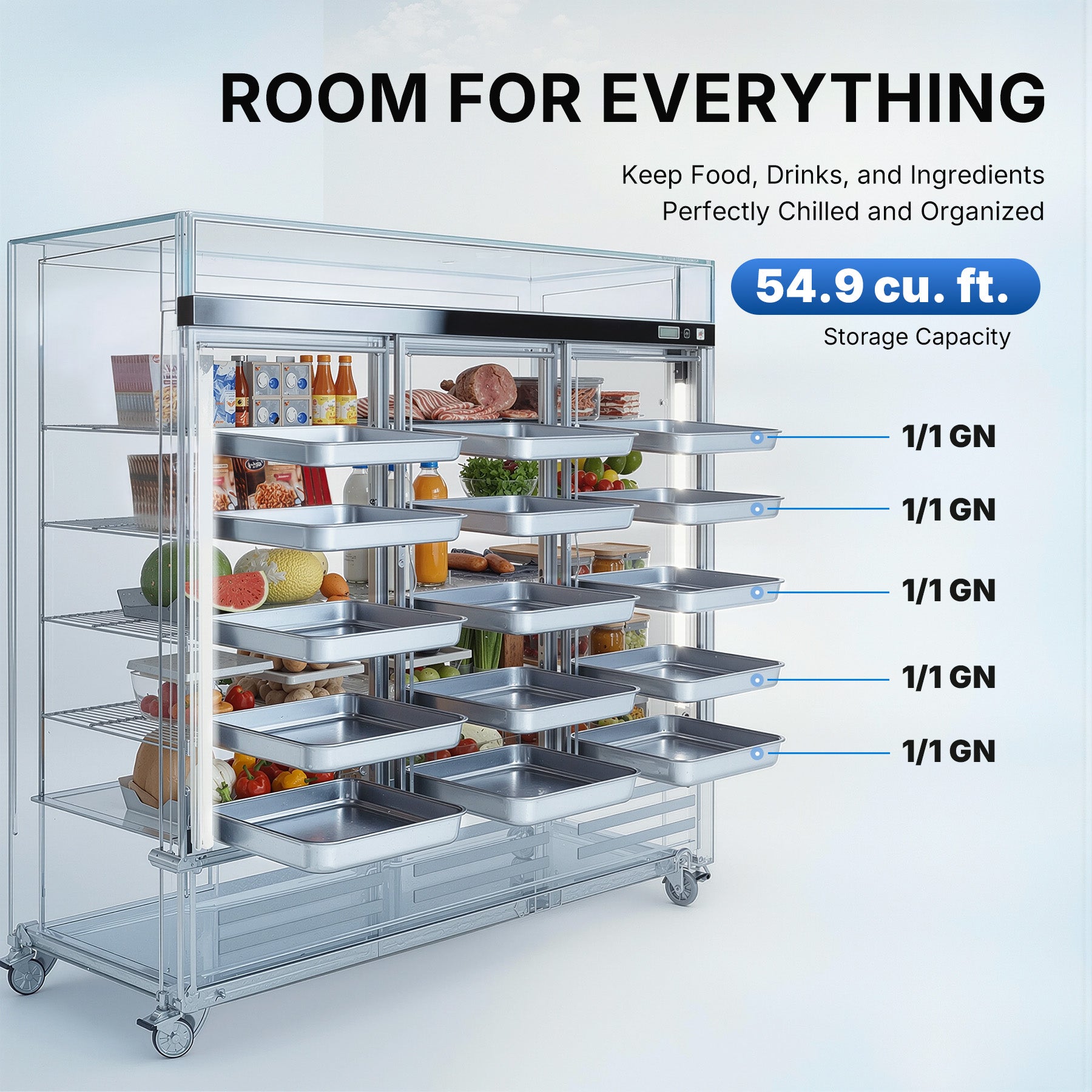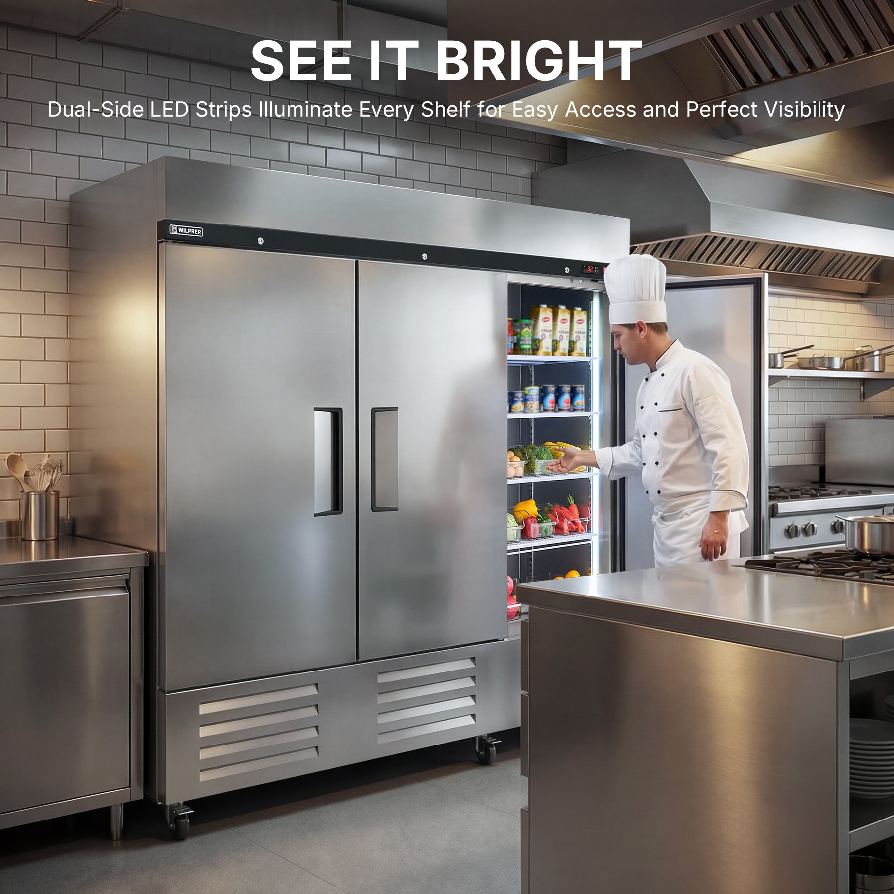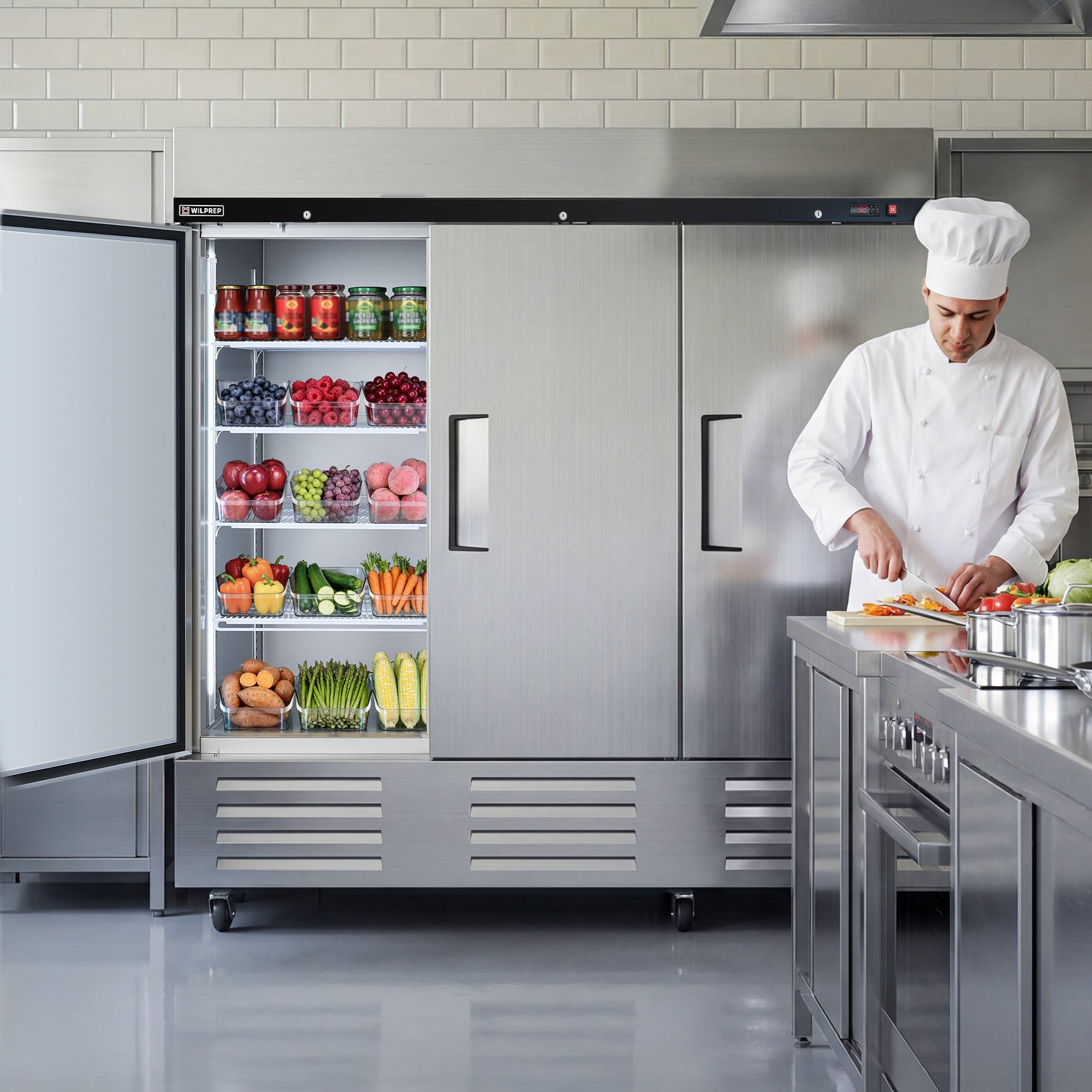 Room for All: With 54.9 cu. ft. of storage and 12 fully adjustable shelves, Wilprep's 81 in. triple-door commercial fridge adapts as fast as your menu changes. Stock up on family-sized trays, tall bottles, or bulk ingredients without a squeeze.
