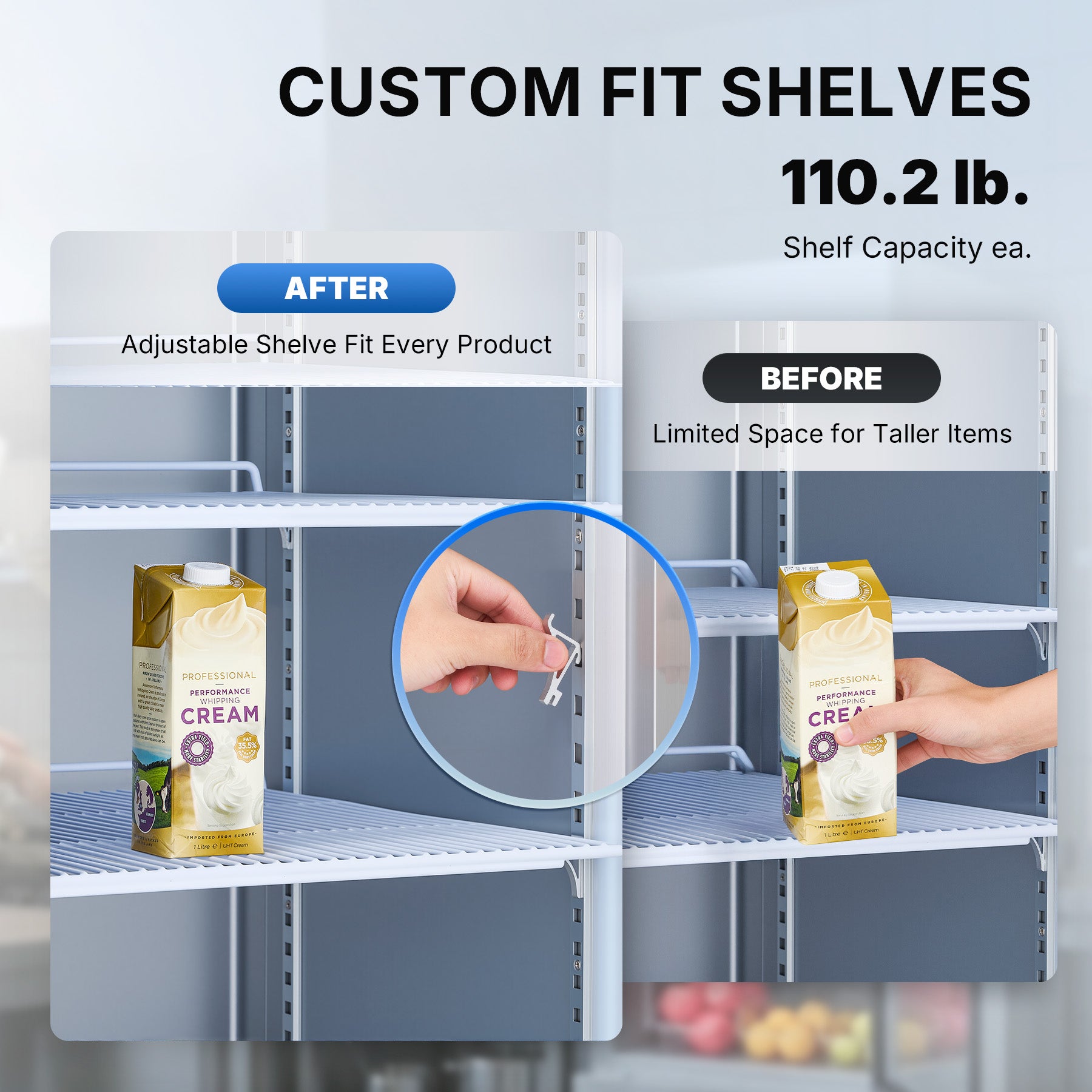Pick Your Perfect Setup: Pick from single, double, or triple doors with 4, 8, or 12 adjustable shelves, giving you complete control to organize beverages, snacks, or large ingredients exactly how your kitchen or business needs.