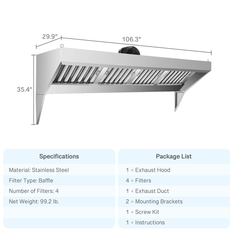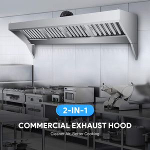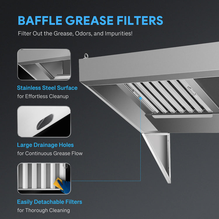 - Built for Durability: Crafted from premium quality stainless steel, our commercial exhaust hood offers exceptional heat and corrosion resistance. Its solid weld construction ensures long-lasting durability and effortless cleaning.