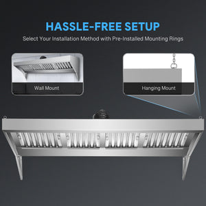 - Effortless Installation: Our commercial range hood is equipped with two sturdy mounting brackets for secure wall installation, and the pre-installed mounting rings make hanging it over your stoves a breeze.