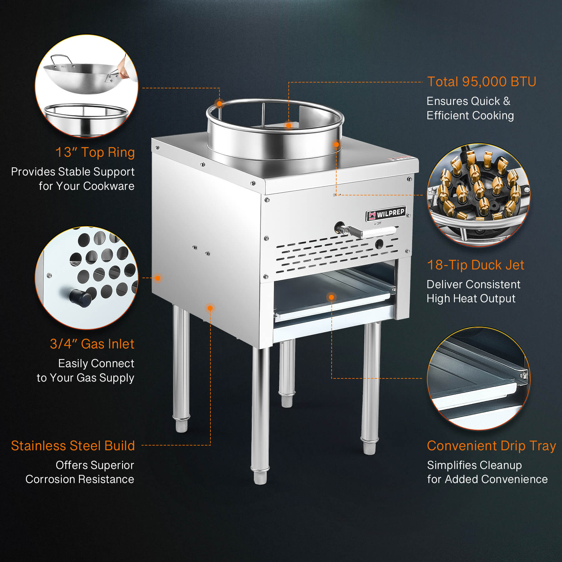 Boost Kitchen Productivity: Enhance your culinary performance with Wilprep's stock pot range, featuring an 18-tip duck jet burner that delivers a total of 95,000 BTUs. Enjoy a consistent flow of delicious meals even during peak hours.