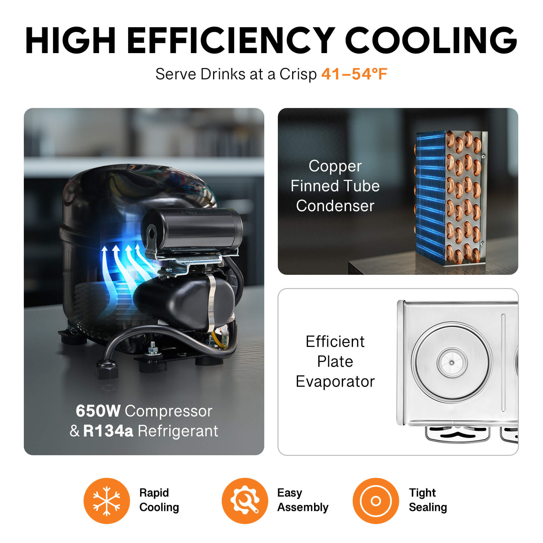 Efficient Cooling System: Equipped with a powerful 650W compressor, a copper tube condenser, and a plate evaporator, our refrigerated juice dispenser rapidly cools beverages and keeps them ready to serve at 41-54°F.