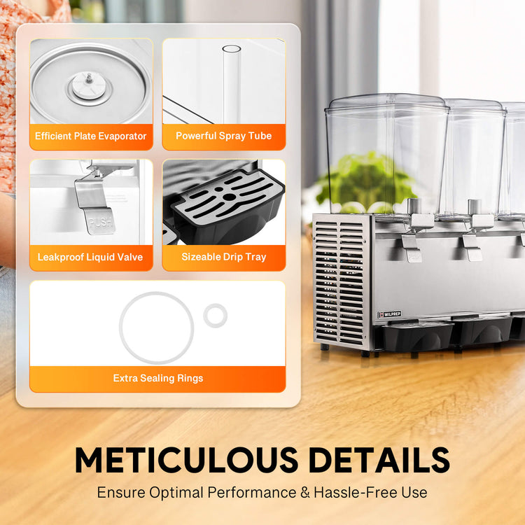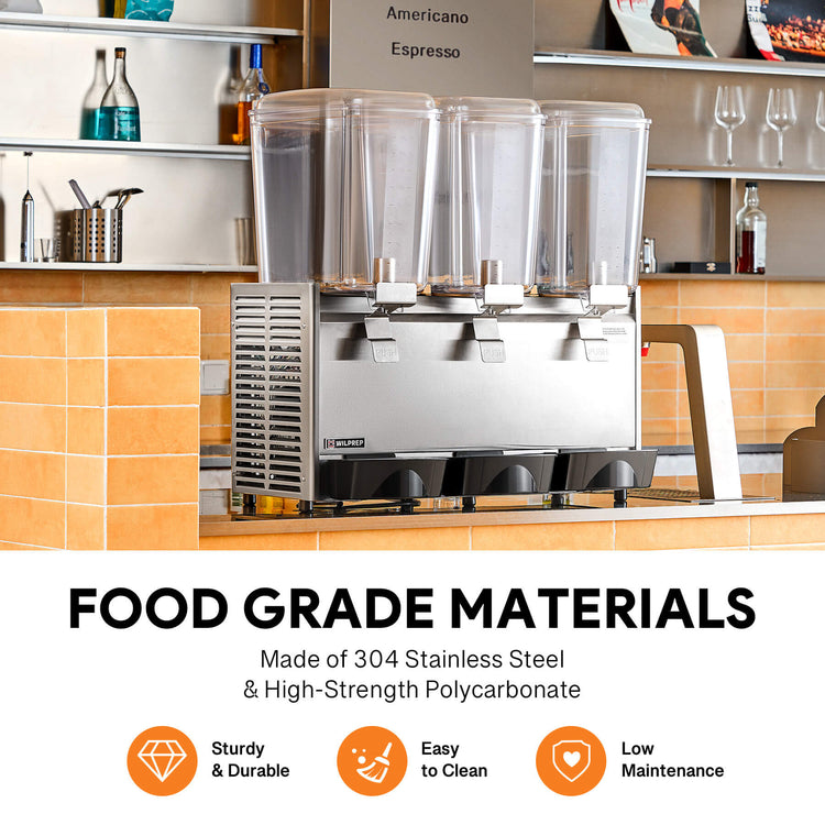 14.4 gal. Large Capacity: Serve more guests or customers with Wilprep's 3-tank commercial beverage dispenser. Each tank holds up to 4.8 gallons (18L), giving you the flexibility to offer a variety of drinks without frequent refills.