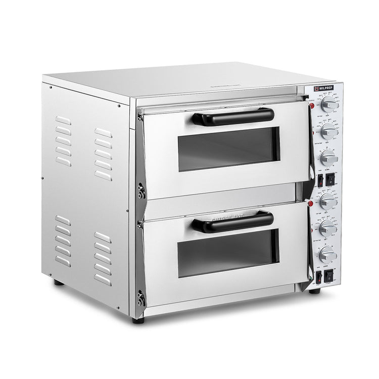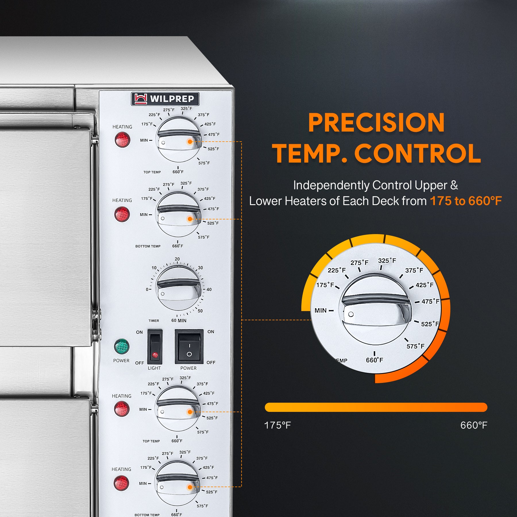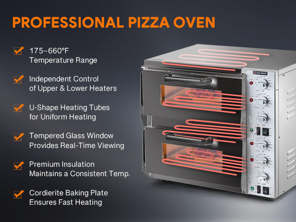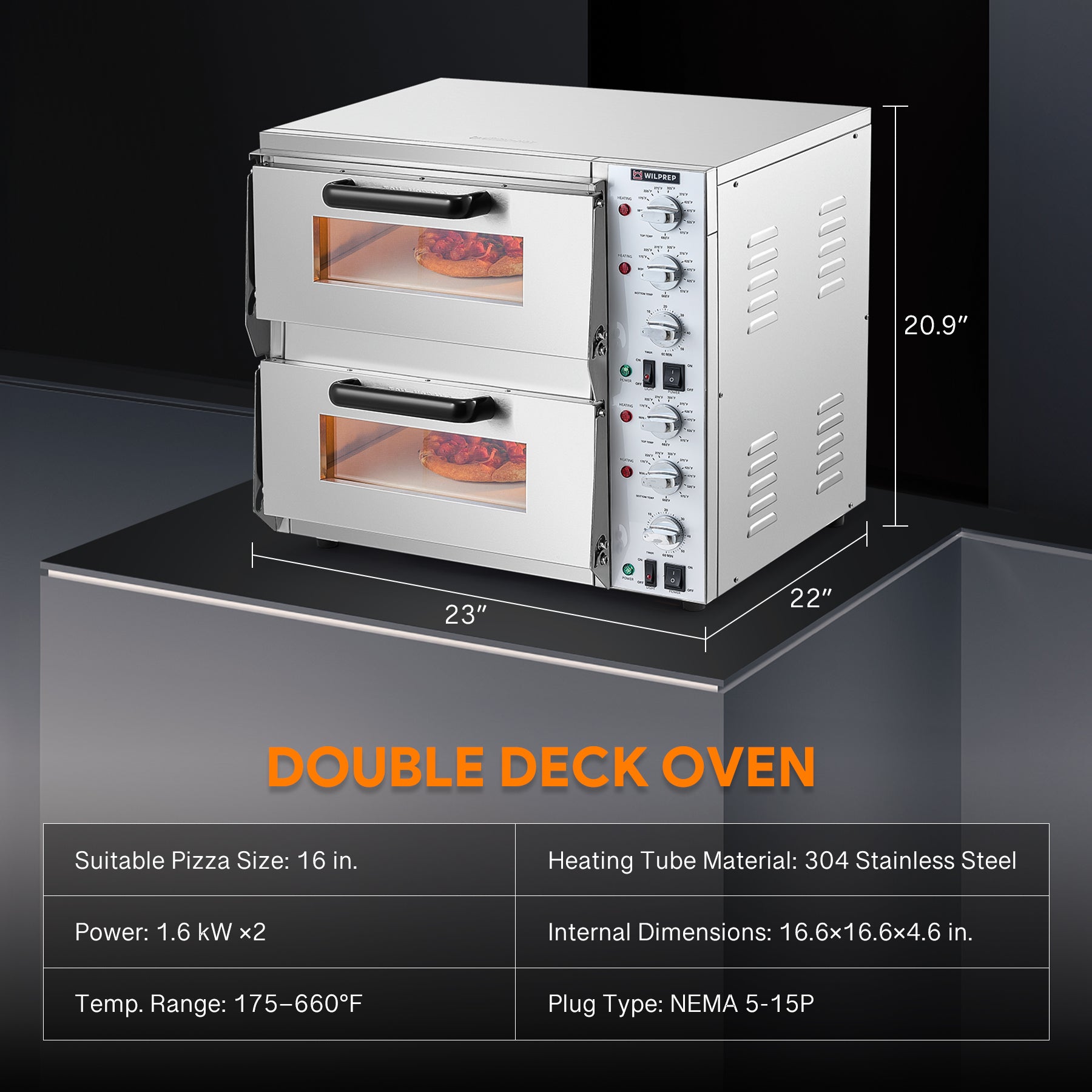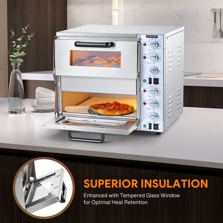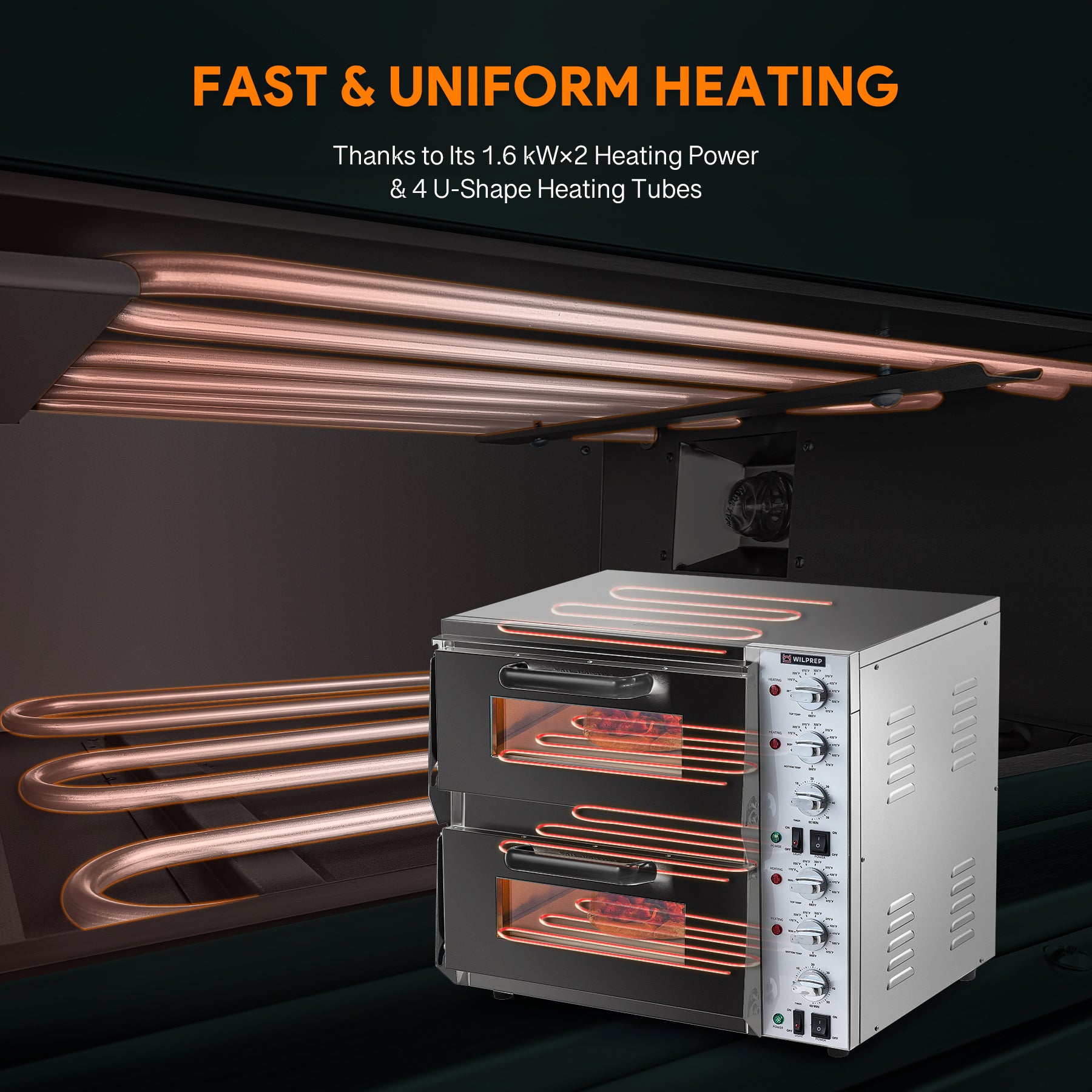 Superior Baking Performance: Wilprep's electric pizza oven delivers speedy service with its spacious 5-gallon capacity and powerful 1.6kW heating power per chamber, ensuring quick baking for pizzas up to 16". Serve up order after order throughout the day!
