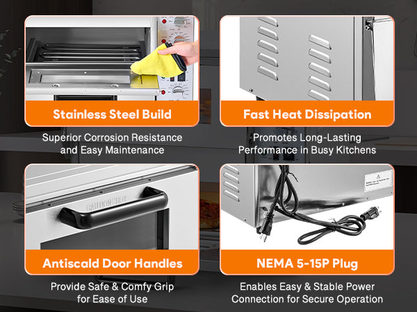 Stainless Steel Built: Crafted from 304 stainless steel, our indoor pizza oven is built to last, resisting corrosion and rust. Its easy-to-clean surface ensures hassle-free maintenance, perfect for busy pizzerias, bakery shops, kitchens, and restaurants.