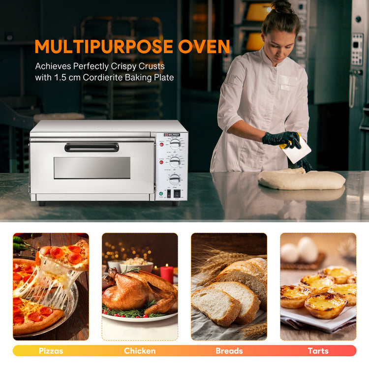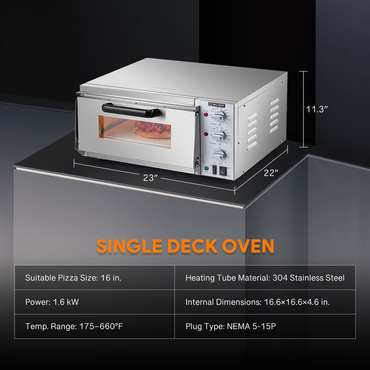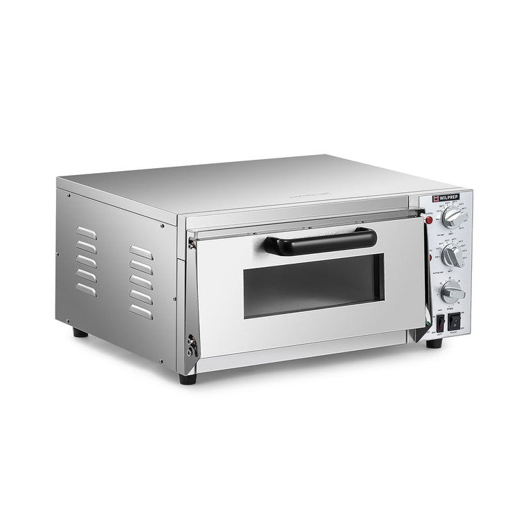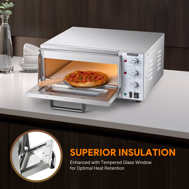 Superior Baking Performance: Wilprep's electric countertop pizza oven offers fast, efficient service with its spacious 5-gallon chamber and 1.6kW heating power per chamber, perfect for commercial pizza ovens. Bake pizzas up to 16" in size with quick turnaround times to keep up with high-demand orders.