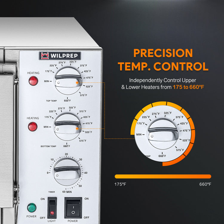 Perfectly Controlled Baking: Designed for precision, this pizza oven commercial model features dual knobs for independent control of upper and lower heating temperatures, ranging from 175°F to 660°F. With a 5-60 minute timer, you can achieve the ideal level of crispiness and texture for each pizza.