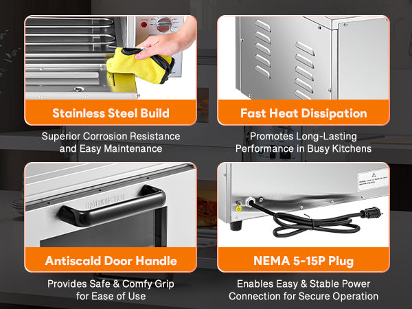 Stainless Steel Built: Built to last, this countertop pizza oven is crafted from durable 304 stainless steel, resisting corrosion and rust. Its easy-to-clean surface makes maintenance a breeze, ideal for busy pizzerias, bakery shops, kitchens, and restaurants.
