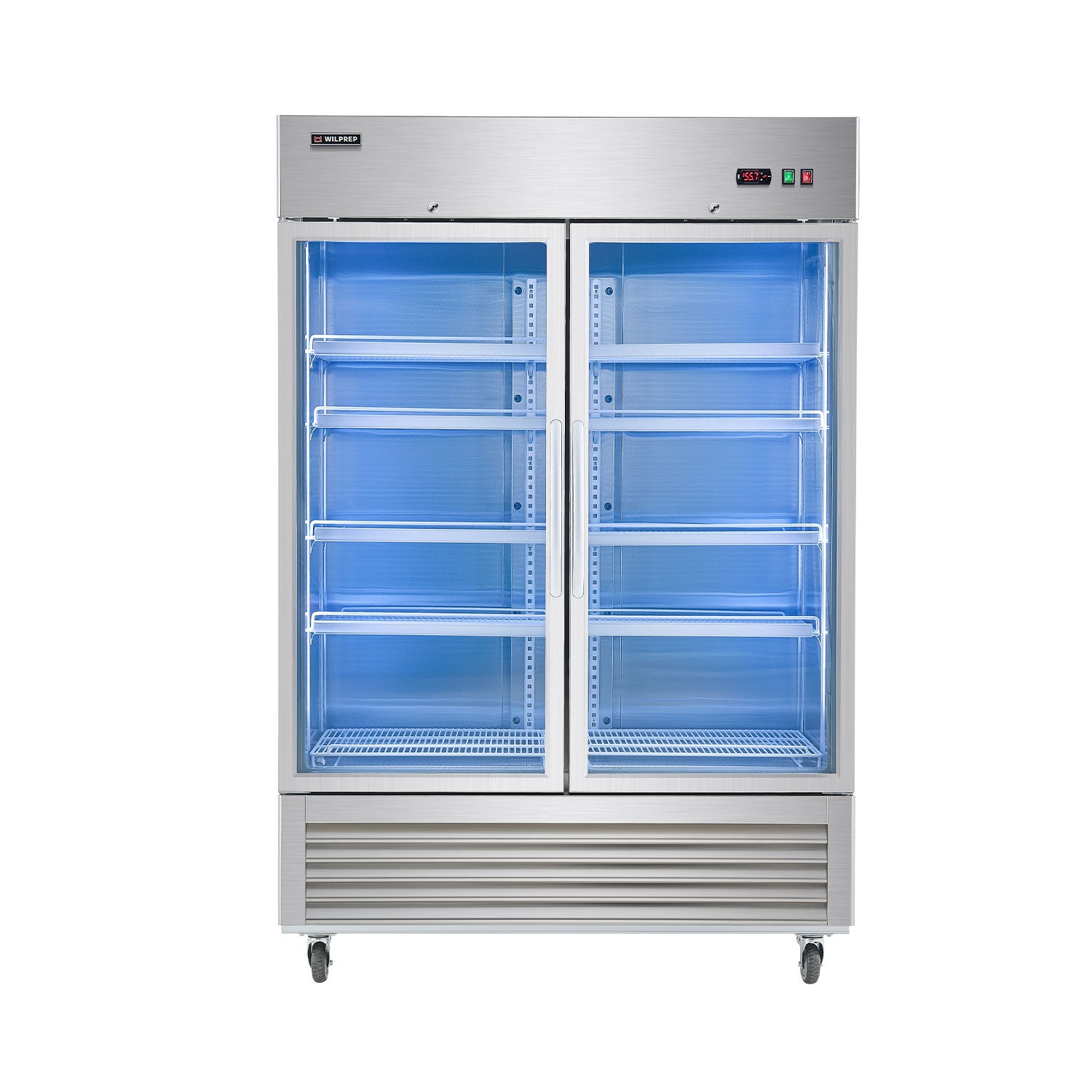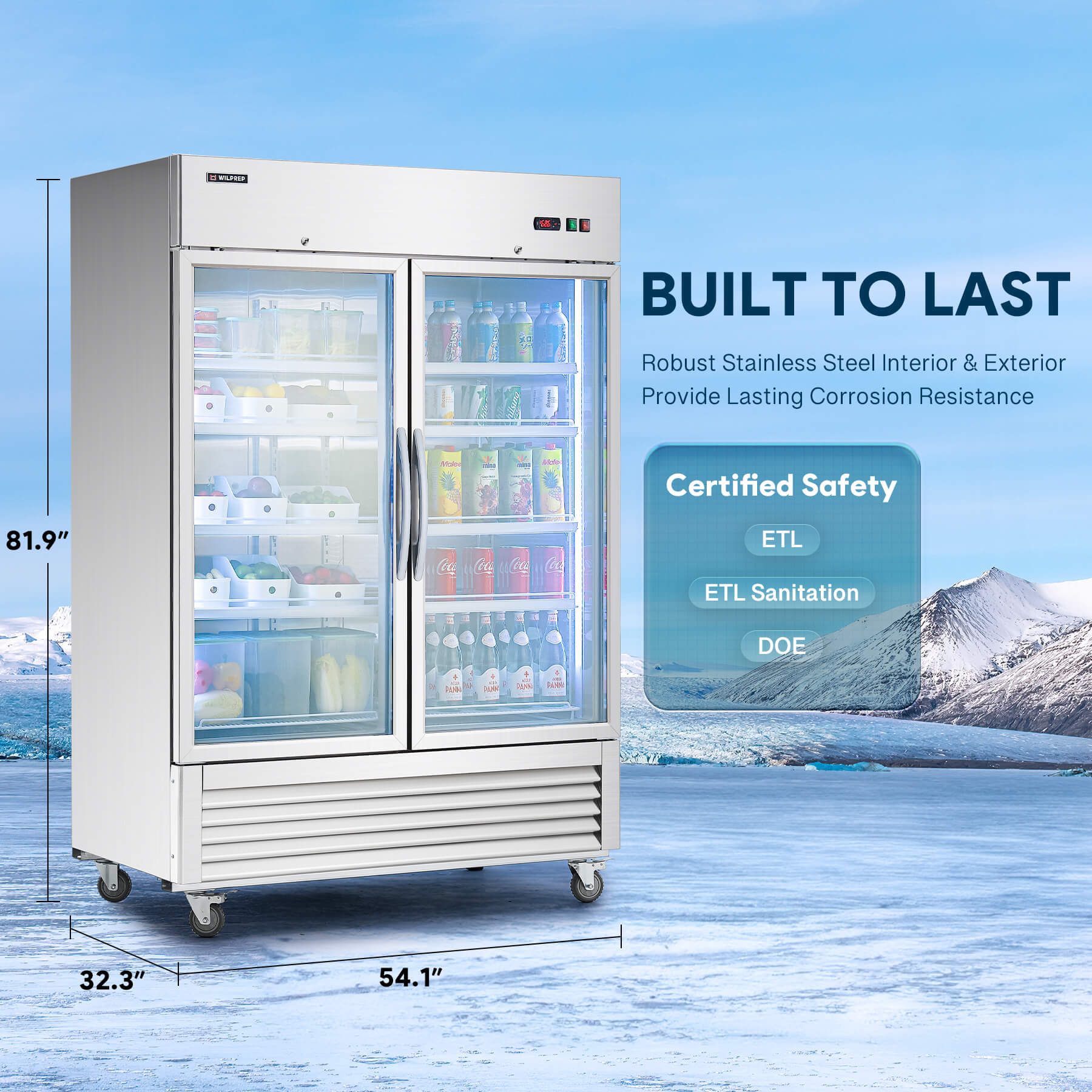 Mega Capacity Fridge for All Needs: Wilprep's 54" double glass door commercial refrigerator offers a volume of 42.2 cu. ft. and a temperature range of 32-50°F, letting you properly store and showcase drinks, fruits, and more merchandise for your business.