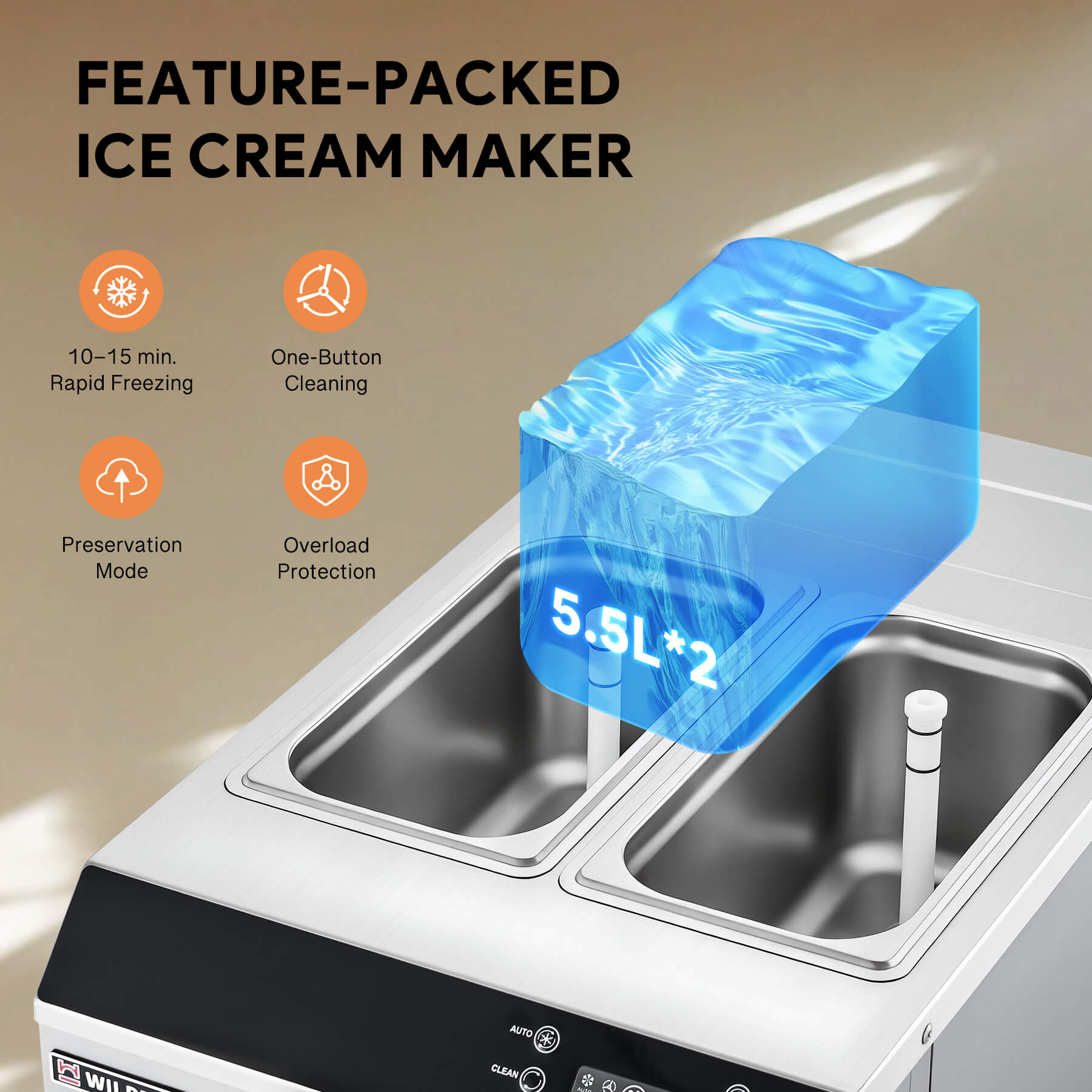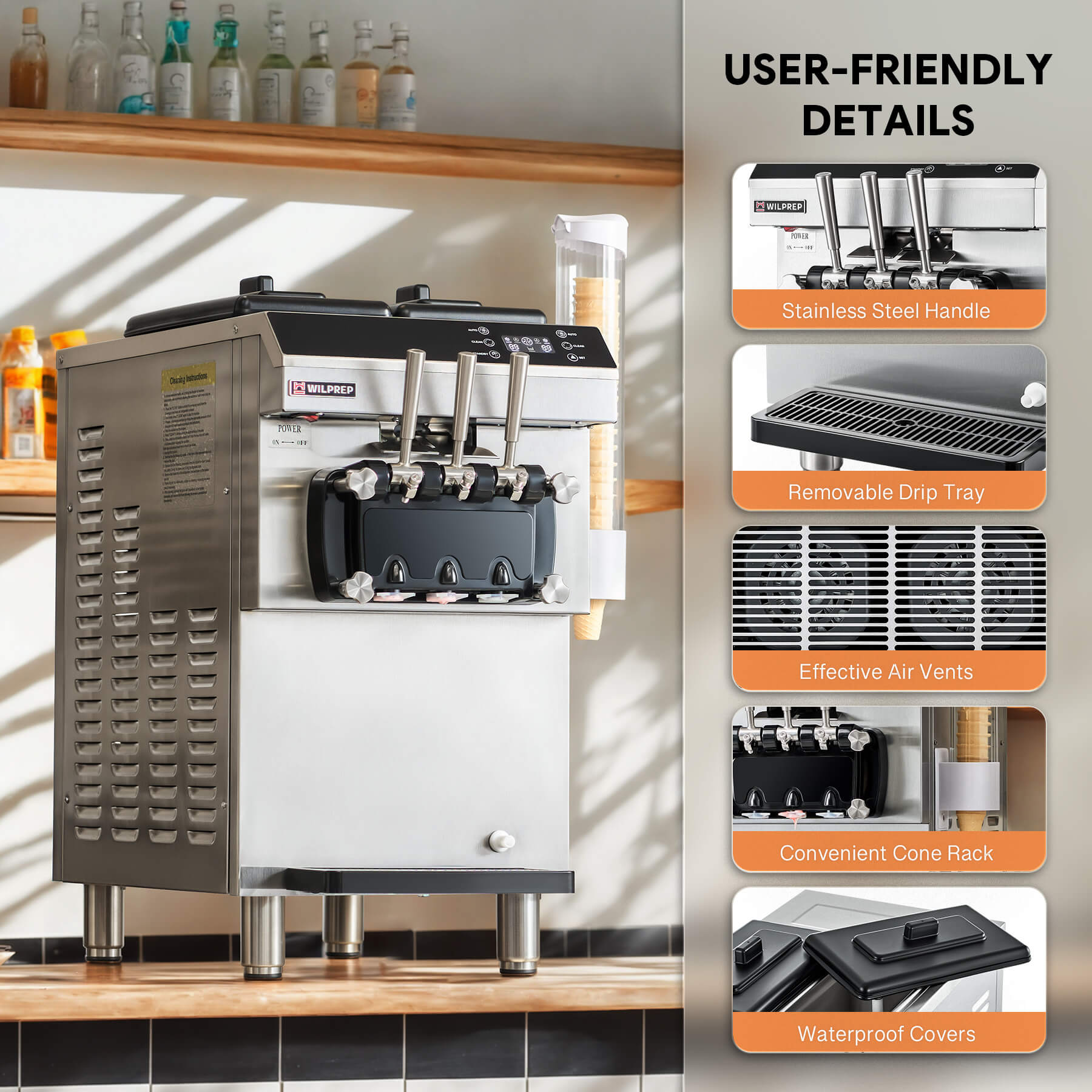 Creamy Ice Cream in Minutes: Wilprep's ETL & ETL Sanitation certified commercial ice cream maker features a high-efficiency Embraco compressor that easily transforms mix into creamy ice cream with perfect overrun, offering up to 3 different flavors