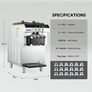 Compact Yet Durable: At only 16.5 in. wide, this countertop ice cream maker with 2 hoppers fits easily into small spaces and is constructed with 304 stainless steel for long-lasting use and superior corrosion resistance