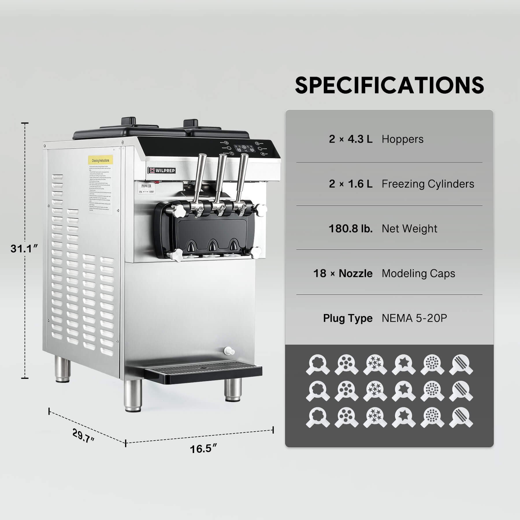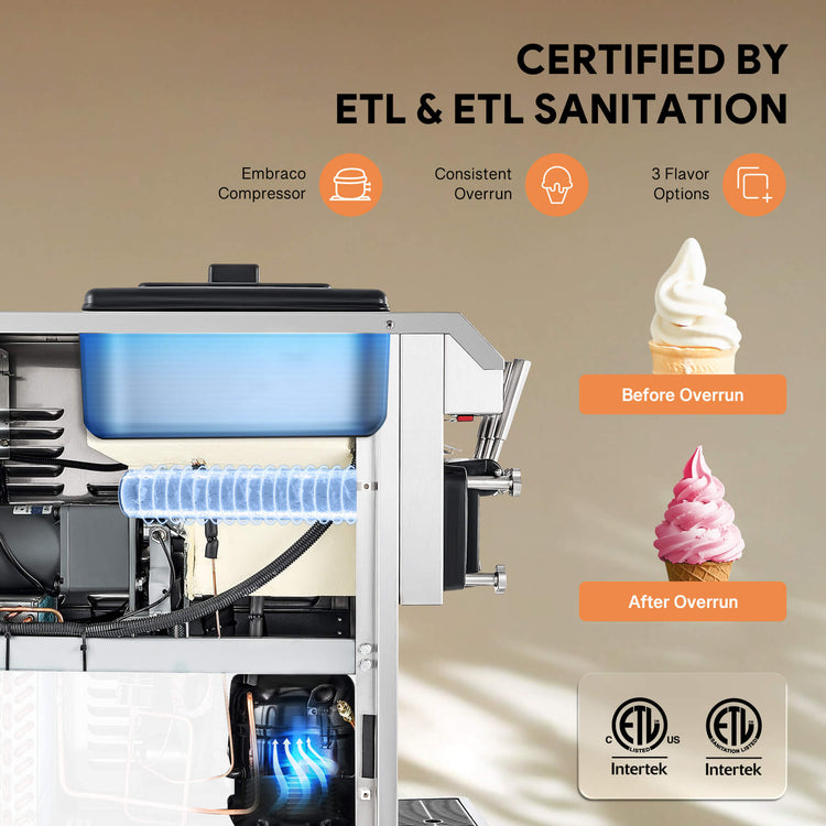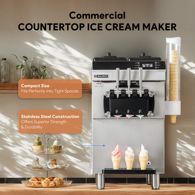 Creamy Ice Cream in Minutes: Wilprep's ETL & ETL Sanitation certified commercial ice cream maker features a high-efficiency Embraco compressor that easily transforms mix into creamy ice cream with perfect overrun, offering up to 3 different flavors
