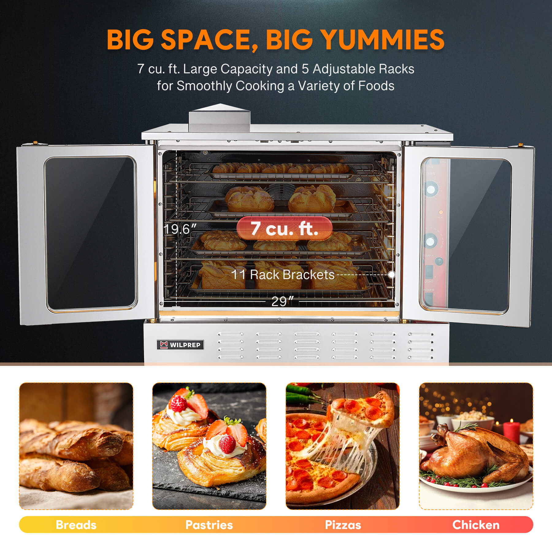 - Large Cooking & Baking Capacity: Wilprep's electric commercial convection oven offers a spacious 7 cu. ft. chamber with 5 racks that can rest on 11 sets of brackets. Benefit from a variety of rack configurations to best accommodate your food, from cakes to pizzas.