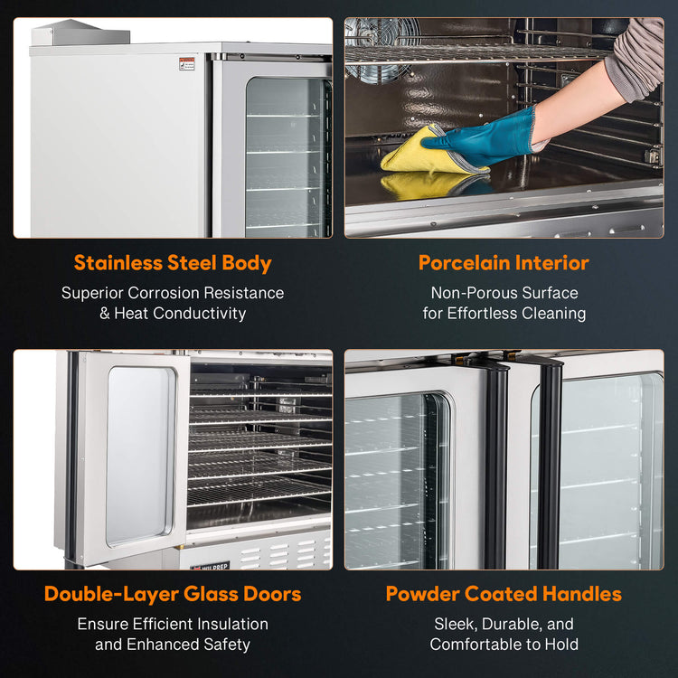 - Commercial-Grade Construction: The porcelain interior of our commercial convection oven provides a non-porous surface for easy cleaning, while the stainless steel exterior offers maximum durability and corrosion resistance.