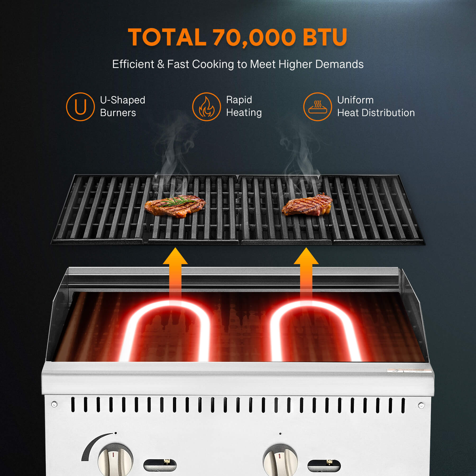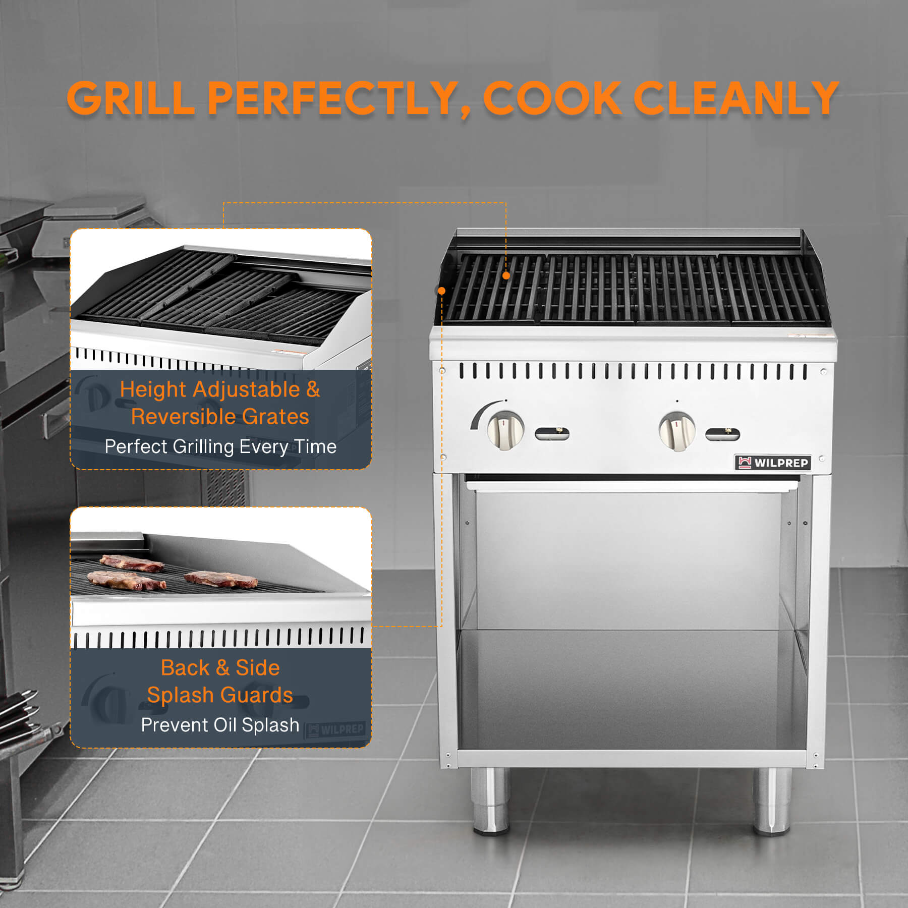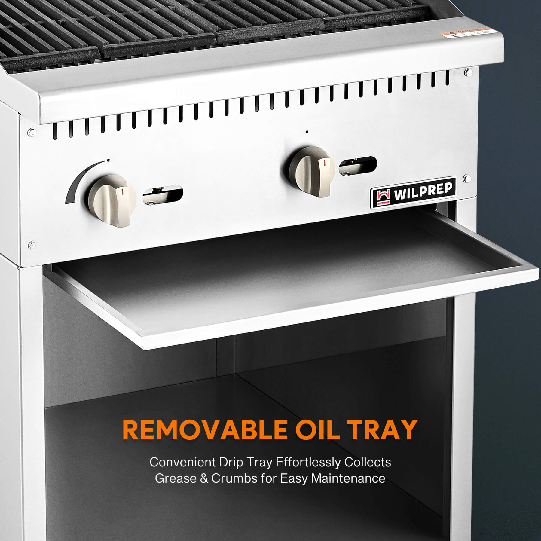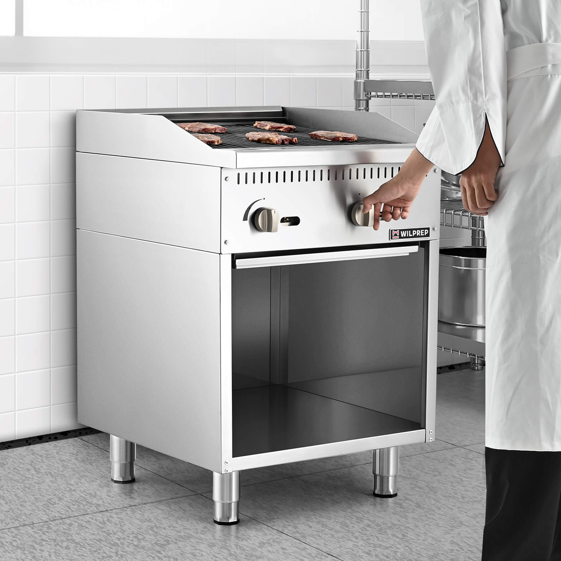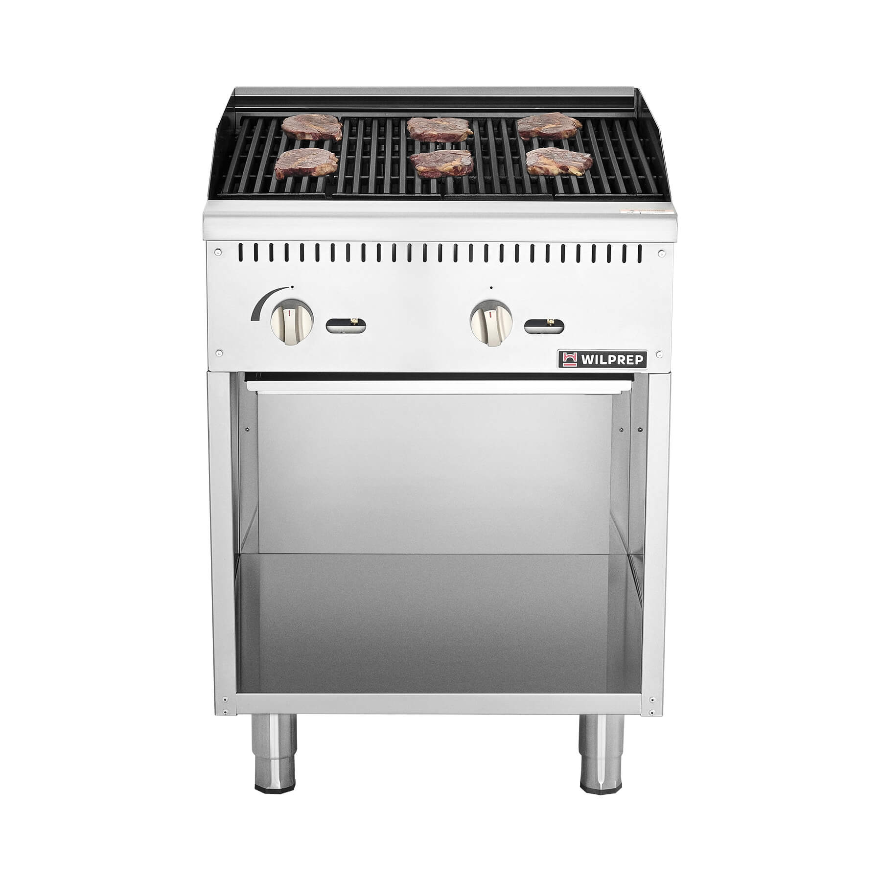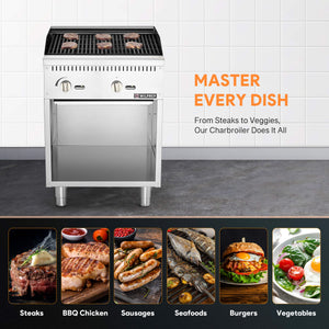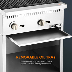 Efficient Delicacy Preparation: This 24-inch charbroiler with storage base by Wilprep features two powerful 35,000 BTU stainless steel U-shaped burners, ensuring rapid and uniform heating for perfect grilling of various foods, from juicy burgers to perfectly charred vegetables.