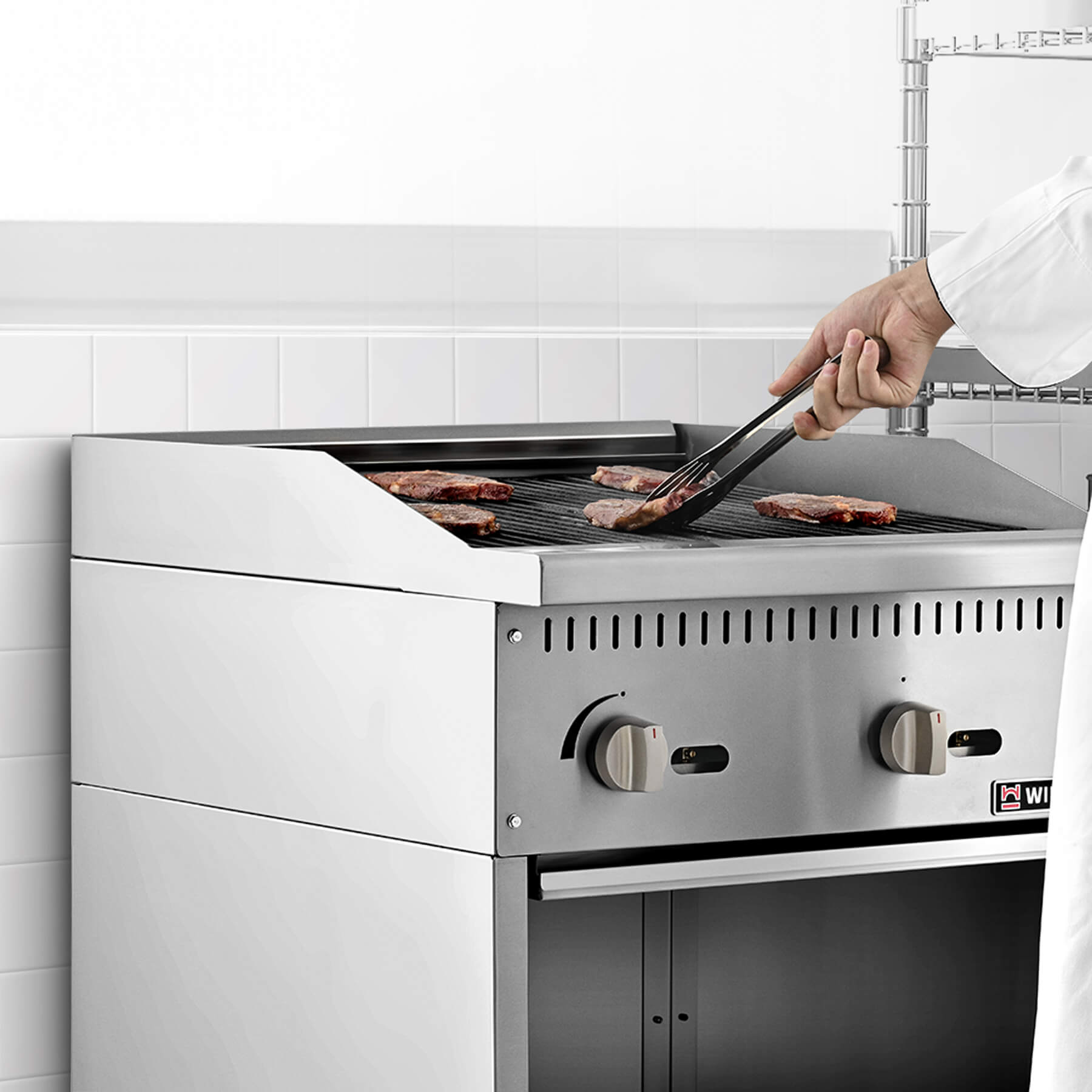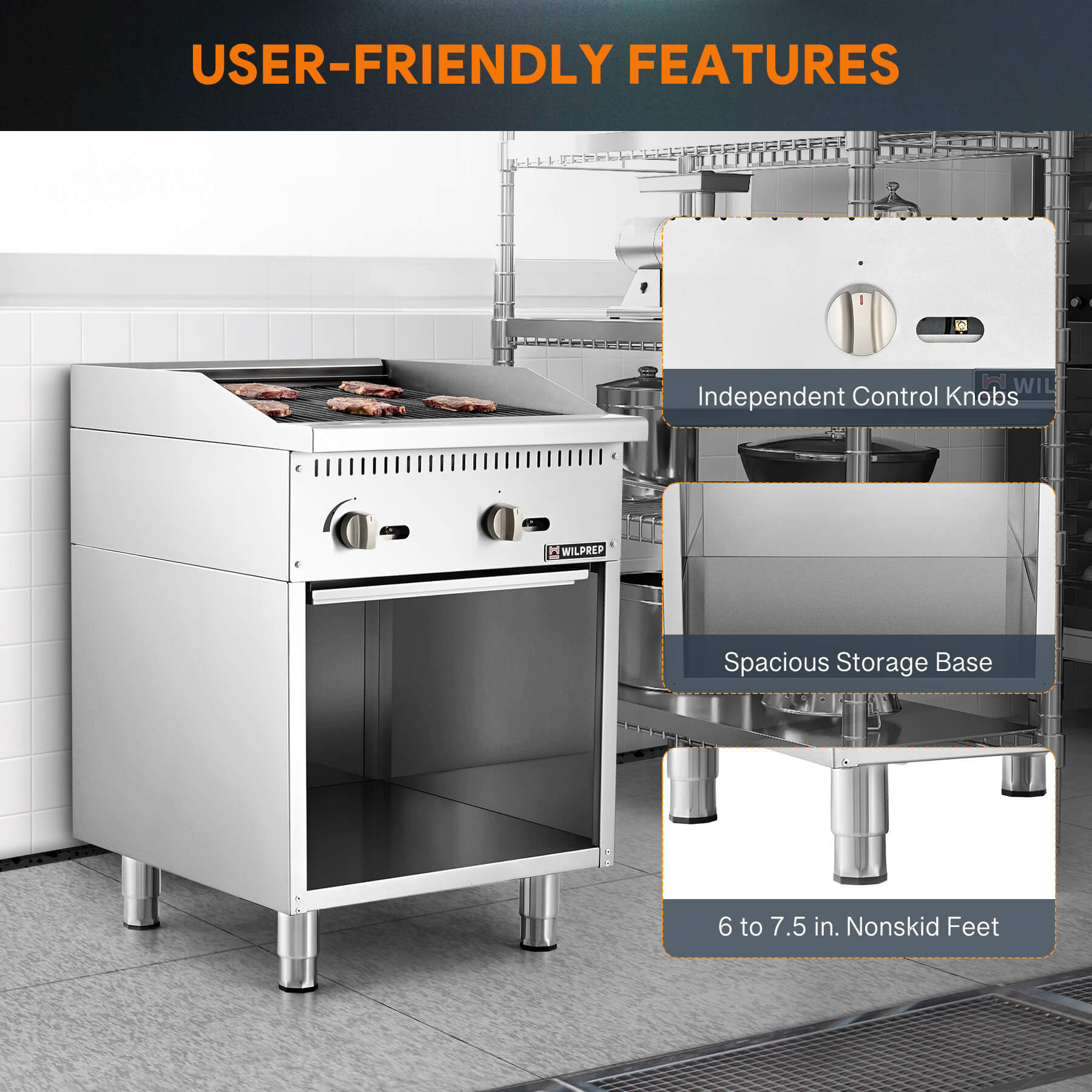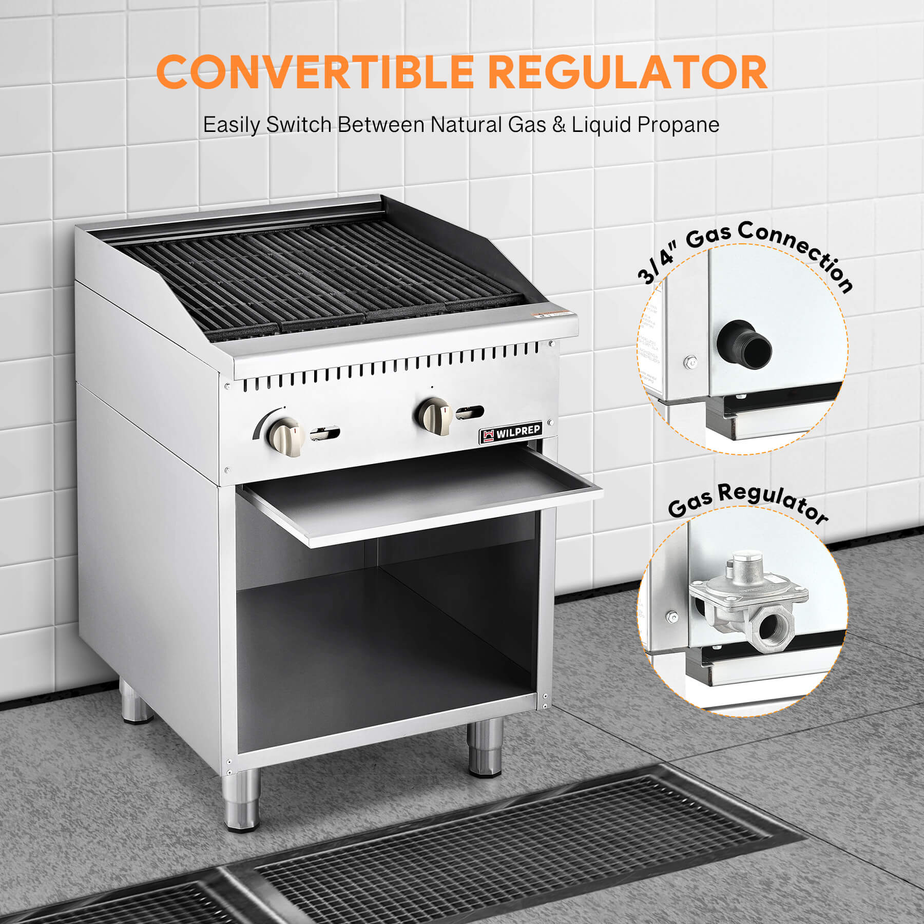 Spacious Storage Base: This commercial gas charbroiler features a large open storage space below, making it a breeze to keep your pots, pans, and cooking essentials right where you need them for all your daily cooking needs.