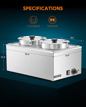 - Large Capacity, Serve Plenty: This 12x20 in. countertop food warmer, complete with two 7.5 qt. insert and covers, easily accommodate generous portions of your favorite dishes, making it perfect for bustling buffets, cozy cafes, and lively catering events.